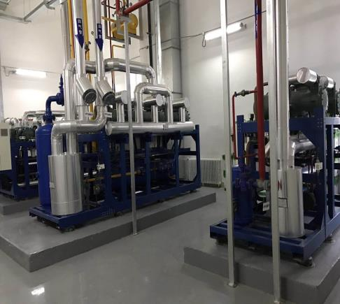 制冷設備:萊富康壓縮機頭,冷風機選用百爾。制冷劑選用R507A環保制冷劑;融霜方式:穿堂為自然融霜,冷藏庫和低溫庫為熱氟融霜,機房在一樓設一單獨設備間,蒸發冷置于樓頂。