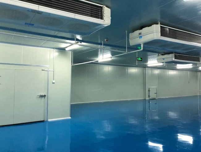 生物制藥公司醫藥防爆冷庫建造,溫度要求2-8℃,規模400立方米。庫體采用10cm厚的聚氨酯填充,雙面彩鋼板。阻燃級別B1,耐火極限應至少為3小時,根據實際冷庫容積合算冷庫保溫板的用量及造價成本。冷庫地面采用3mm的sbs防潮層,PE防潮膜及雙層厚度50mmxps擠塑保溫板,20cm厚度鋼筋網混凝土澆筑,面層3mm厚敬剛莎地面。醫藥防爆冷庫內部配置2臺DD系列的防爆型的冷風機,及2臺比澤爾防爆壓縮機組,一備一用,防爆等級為IIBT4。其次冷庫新風系統采用防爆型密閉性電動風門,與排風機連鎖控制。冷庫照明系統,采用防爆型LED三防冷風機,外殼防護等級為IP65級,吸頂式安裝,照度不低于30LUX。電控系統采用防爆配電箱,機組控制具備電氣缺相保護、過載/過流保護、低電壓或高電壓保護、控制系統失電后系統設置參數自動恢復,制冷系統低壓保護、高壓保護、自動化霜等功能,機組自動輪值切換運轉。