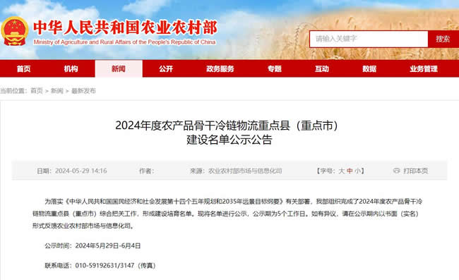 為落實《中華人民共和國國民經濟和社會發展第十四個五年規劃和2035年遠景目標綱要》有關部署,我部組織完成了2024年度農產品骨干冷鏈物流重點縣(重點市)綜合把關工作,形成建設培育名單。現將名單進行公示,公示期為5個工作日。如有異議,請在公示期內以書面(實名)形式反饋農業農村部市場與信息化司。